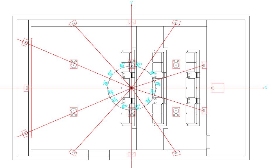 聲學設計:由于視聽室空間比較大,整體系統(tǒng)為32通道,聲學設計為強吸音處理。